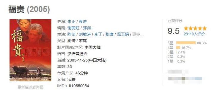 使得陈创的福贵呈现出了与葛优的福贵相当不同的气质,不但提名了上海电视节最佳男演员,电视剧最终豆瓣评分9.5。