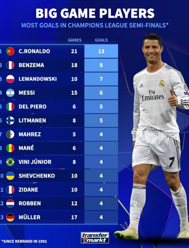 直播吧4月28日讯本赛季欧冠半决赛开赛在即,德转盘点了自92年改制以来欧冠半决赛进球榜,具体如下: